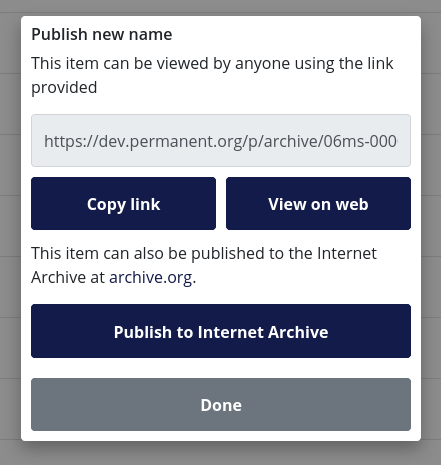 Because the Internet Archive is public domain first and Permanent is private first, public second, we’ve added an option to the publishing workflow. This helps to prevent accidental publication of private records in your archive. You won’t see it if you’re not trying to publish a file. However, when you hit the “Publish” button from the publish menu, you’ll see a new option that lets you send a copy of your published file to the Internet Archive.