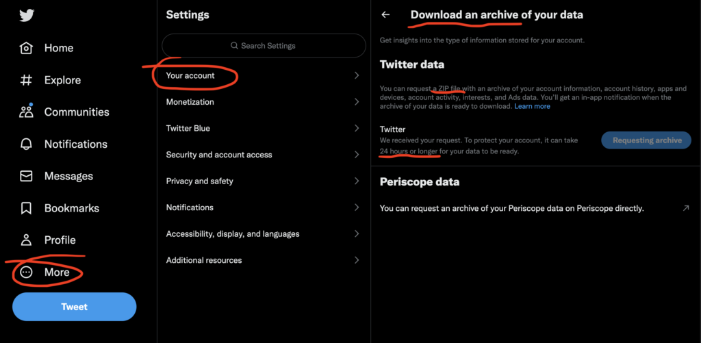 First, download an archive of your Twitter data and tweet history and back this up to a Permanent Archive. Twitter makes this easy for now, but don’t delay because we can’t know what is in store for the future. It already takes several hours or days for Twitter to prepare a ZIP file of your data for download. At this rate, who knows if this feature , or even Twitter as we know it still has several days left.