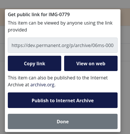 Because the Internet Archive is public domain first and Permanent is private first, public second, we’ve added an option to the publishing workflow. This helps to prevent accidental publication of private records in your archive. You won’t see it if you’re not trying to publish a file. However, when you hit the “Publish” button from the publish menu, you’ll see a new option that lets you send a copy of your published file to the Internet Archive.