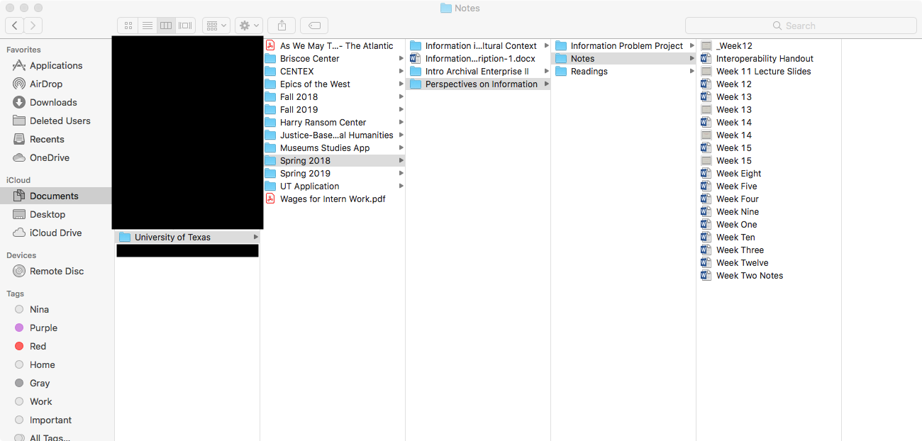 As you can see, this system can use a lot of folders. It’s a lot like a Russian nesting doll. Each folder has a clear title that is either related to a place (University of Texas), a time (Fall 2018 or Week One), and a course (Perspectives on Information) which helps me find what I need with ease.