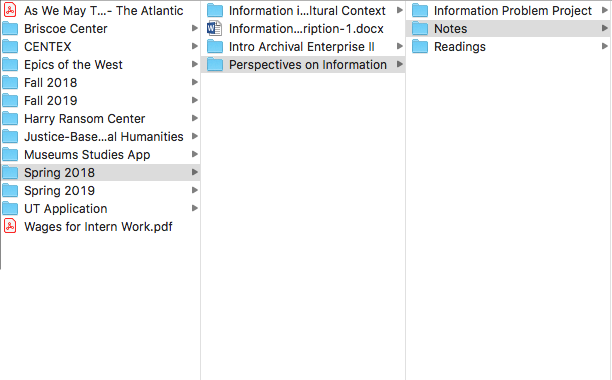 The Spring 2018 subfolder has three folders based on the courses I took that semester. Inside one of those folders, Perspectives on Information, I’ve got folders dedicated to Notes, Readings, and a semester long project. In the readings folder, I’ve got folders dedicated to each week of the semester.